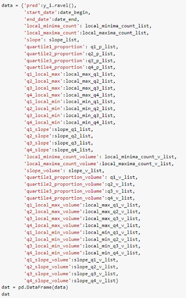 Finally, I subdivided each function into four quarters and calculated each of the previous metrics in each quarter. I also calculated these metrics for volume as well. In the end these were the features in my dataset:
